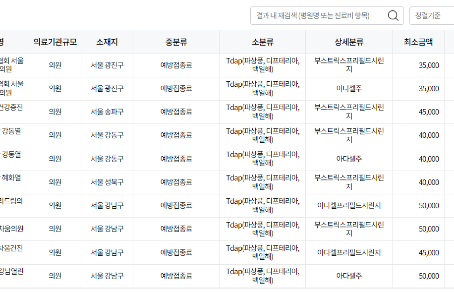 해당 서비스를 이용하면 지역별, 의료기관별로 Tdap 접종 비용을 비교할 수 있어 “우리 동네 백일해 예방접종 가격이 어느 정도인지”를 미리 파악할 수 있습니다. 특히 성인이나 임신부처럼 비급여로 접종해야 하는 경우에는 꼭 확인해보는 것이 도움이 됩니다.