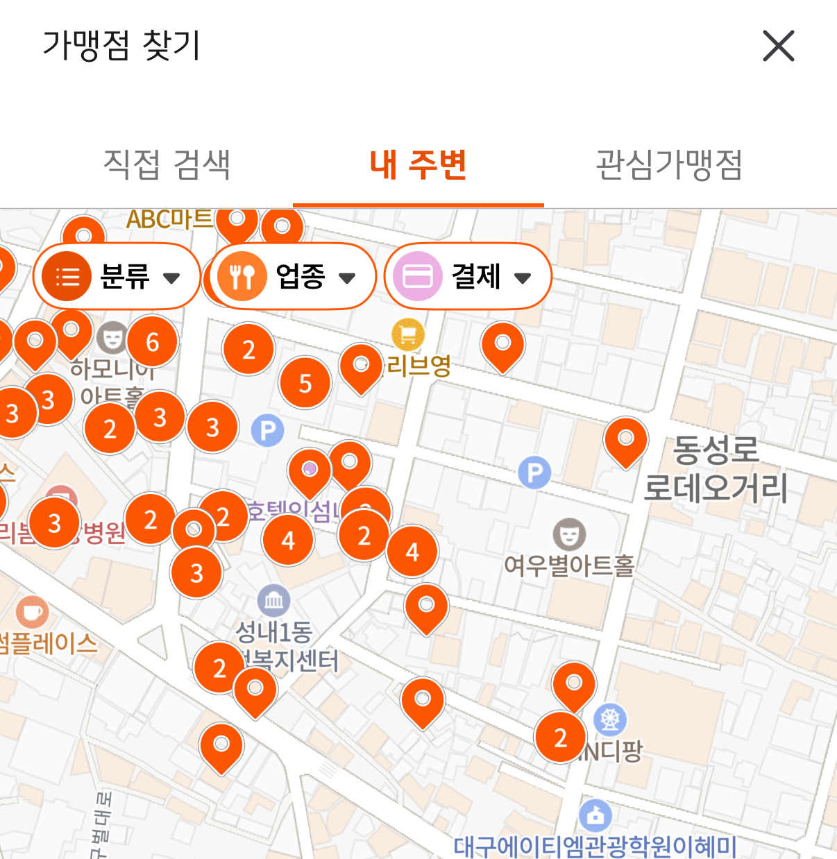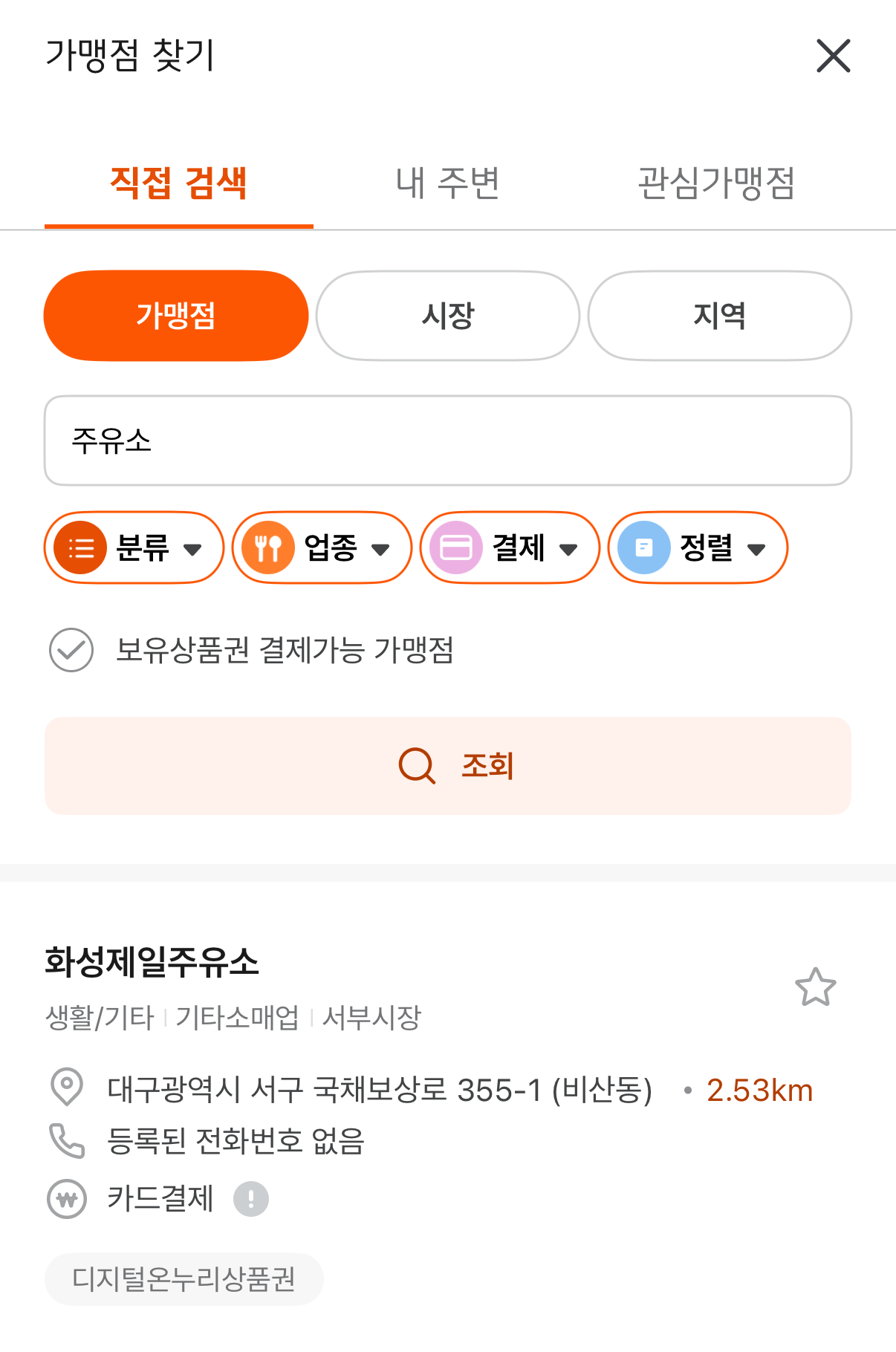 지도 기반으로 내 주변 가맹점을 확인할 수 있고, 업종별로 필터(음식점, 주유소, 약국 등) 검색이 가능합니다.